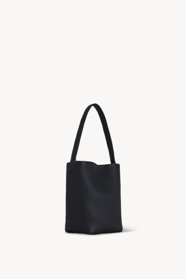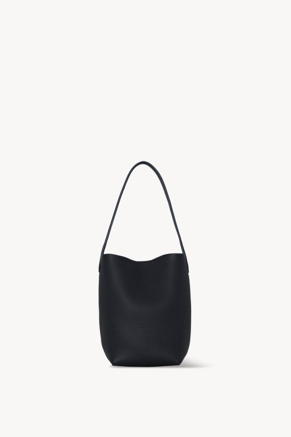 Classic tote bag in textured calfskin leather with interior toggle closure and flat handle.