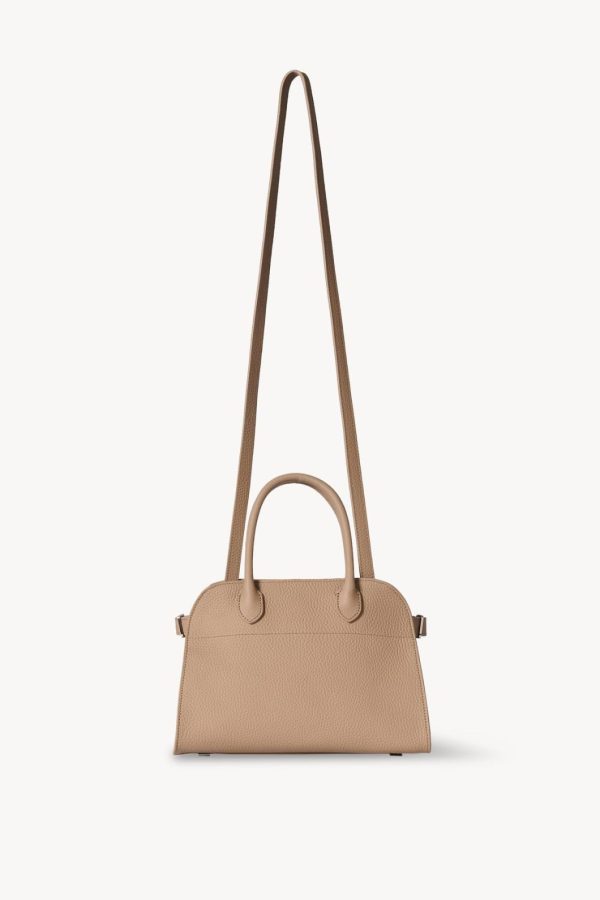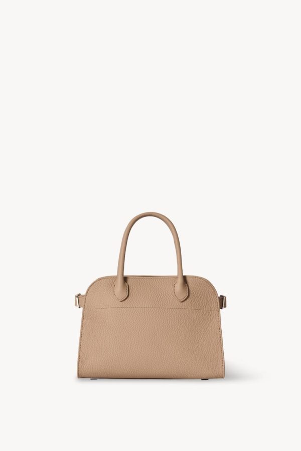 Softly structured top-handle bag in matte grained calfskin leather with belted gusseted side panels and interior toggle closure.