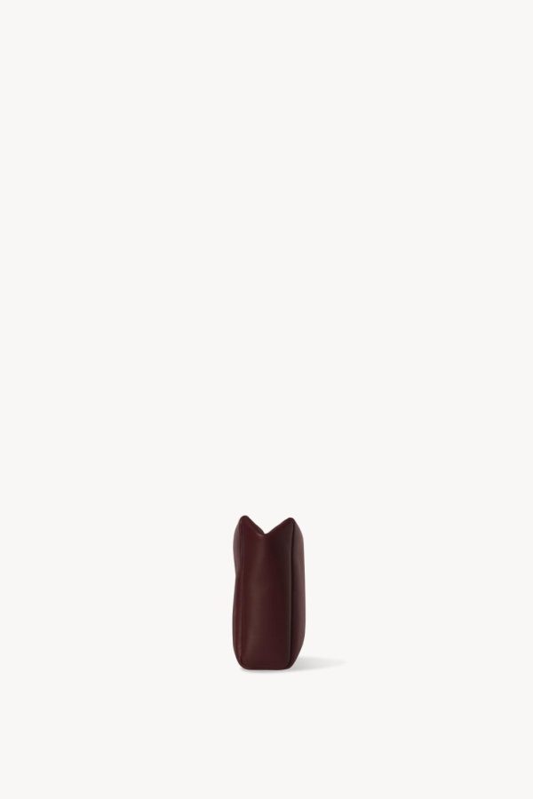 Rectangular clutch in smooth nappa leather with gently folded top, gusseted side panels, and zipper closure.