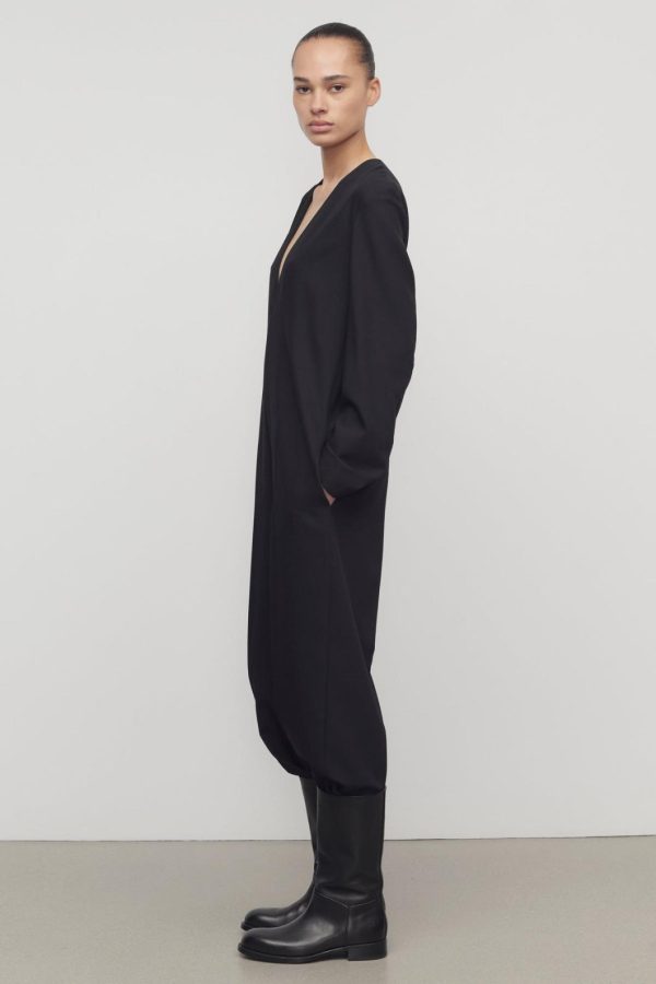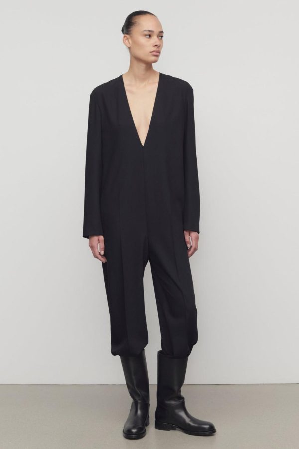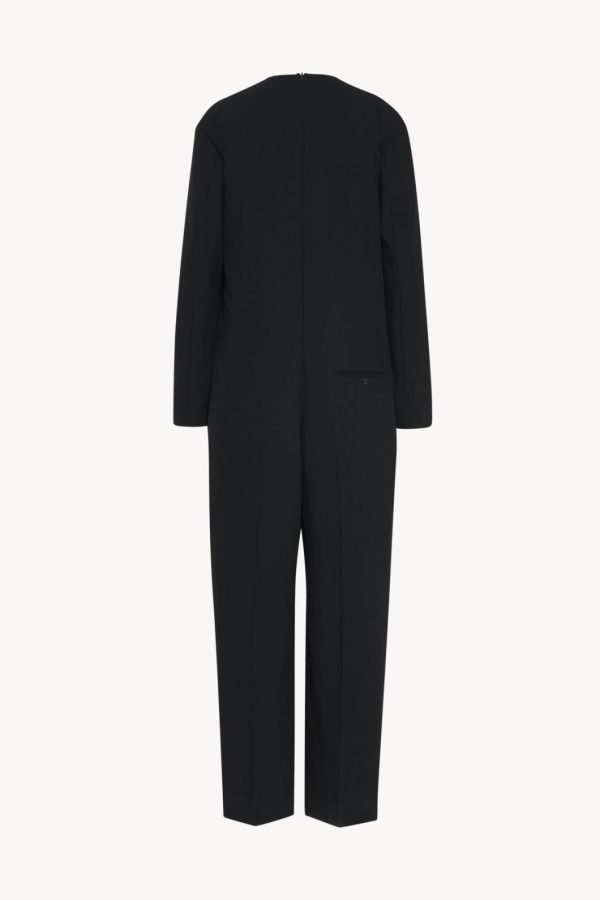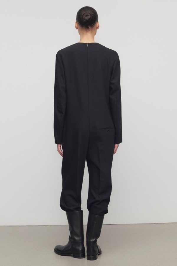 Relaxed tailored jumpsuit in smooth virgin wool gabardine with creased leg, side seam pockets, and center back zip closure.