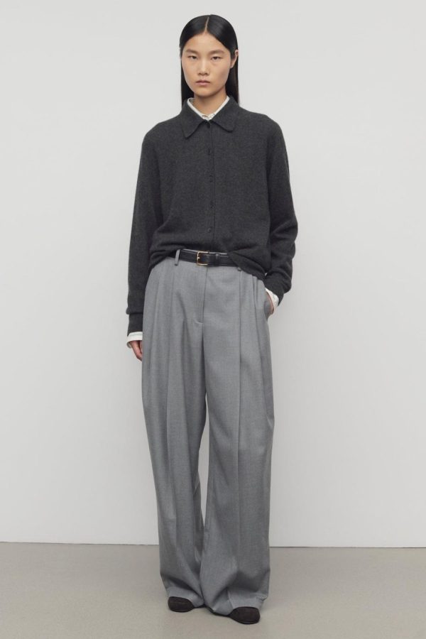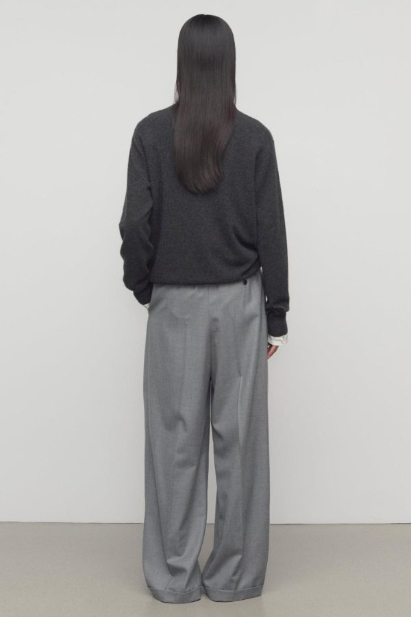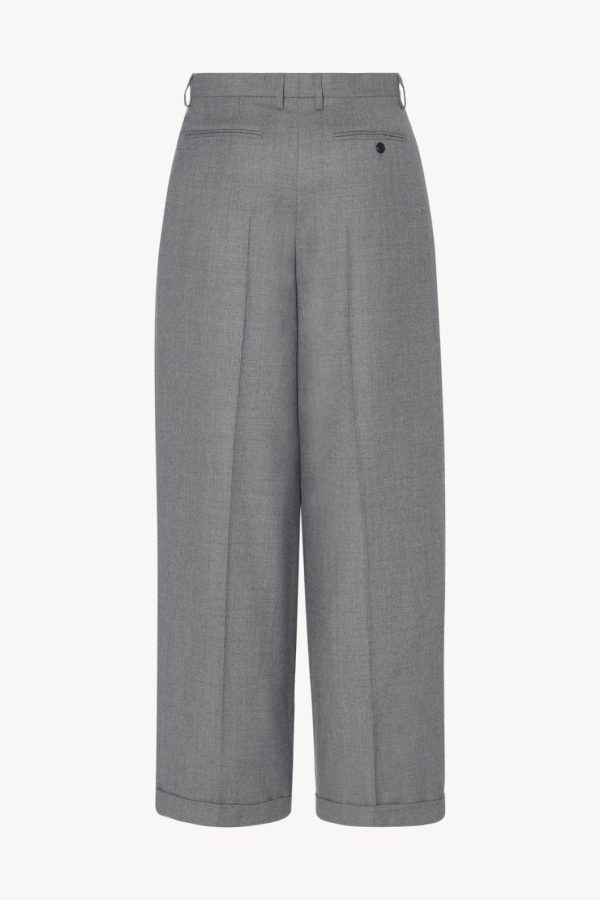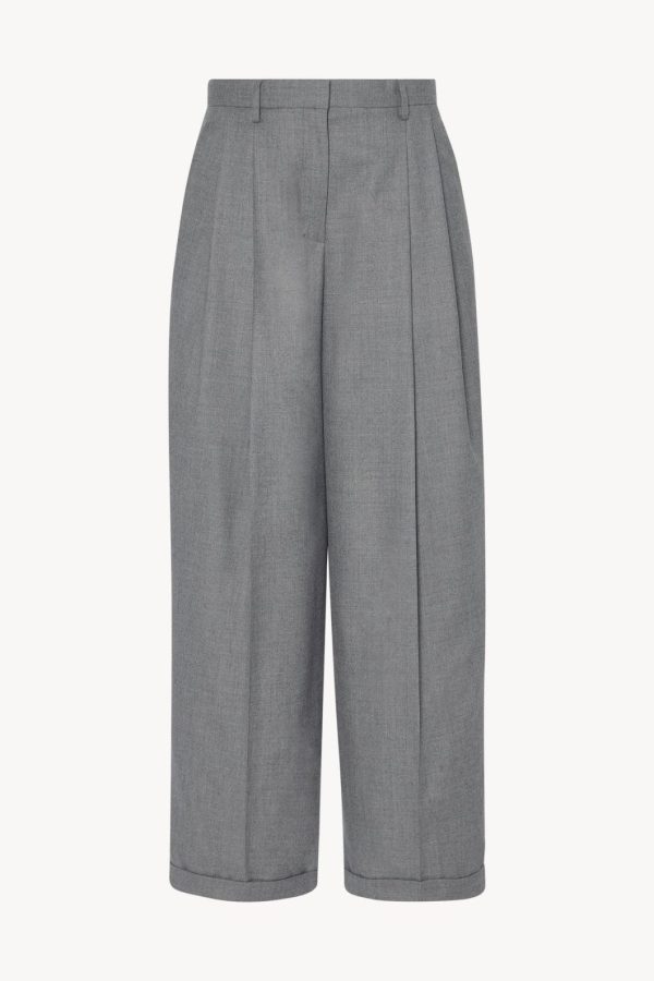 High-rise tailored trouser in virgin wool flannel with wide leg, front double pleats, and slanted side pockets.