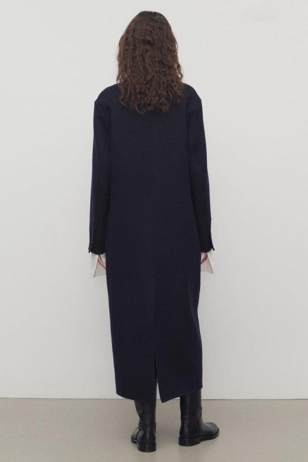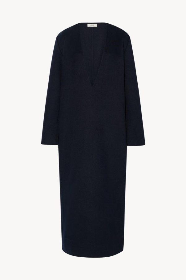 Ankle-length dress in lightweight double-faced cashmere with slightly oversized fit, deep v-neckline, and side seam pockets.