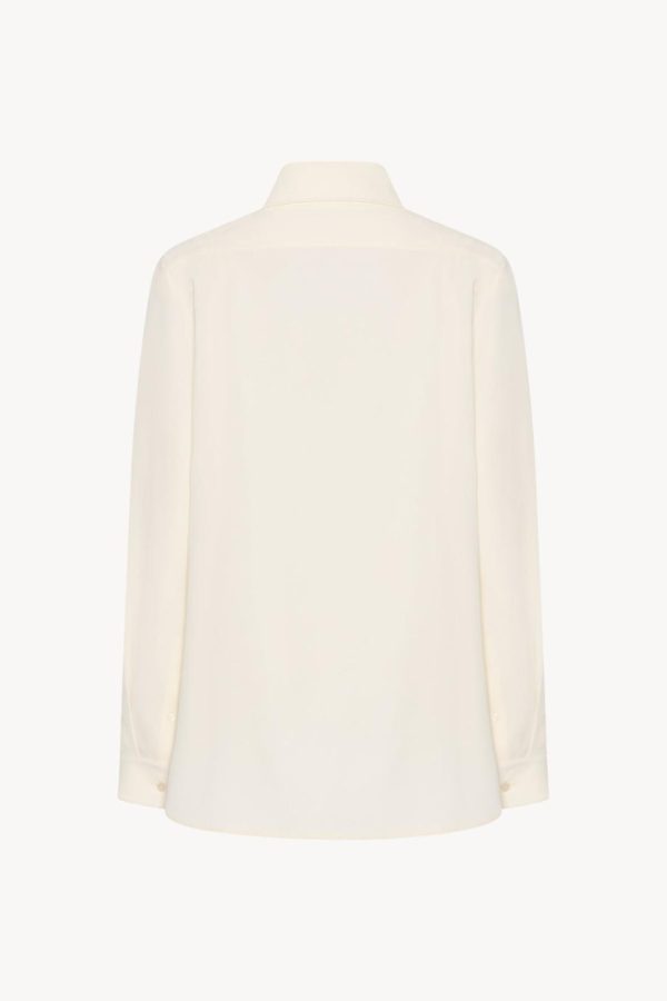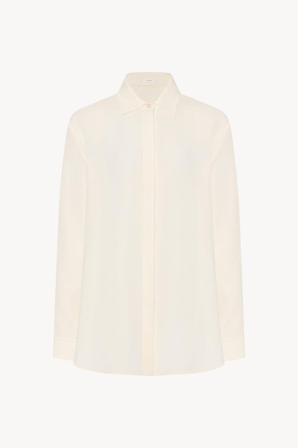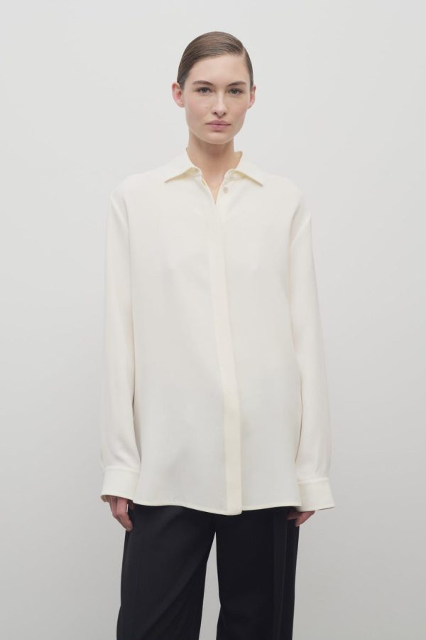 Relaxed button-up shirt in fluid silk crepe with slim back yoke and concealed front button placket.
