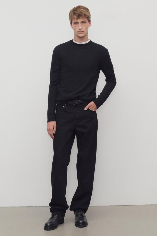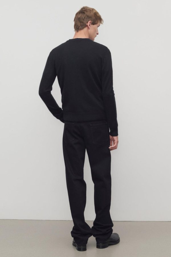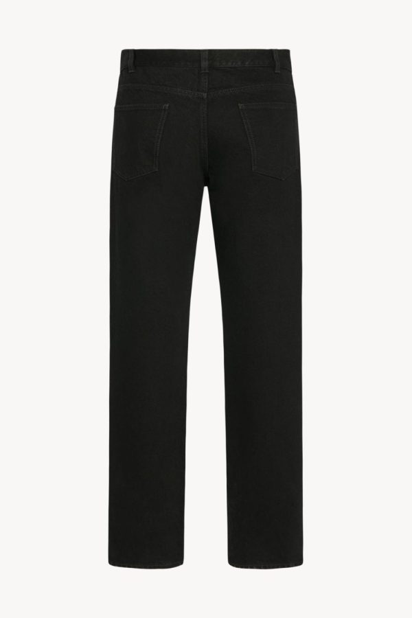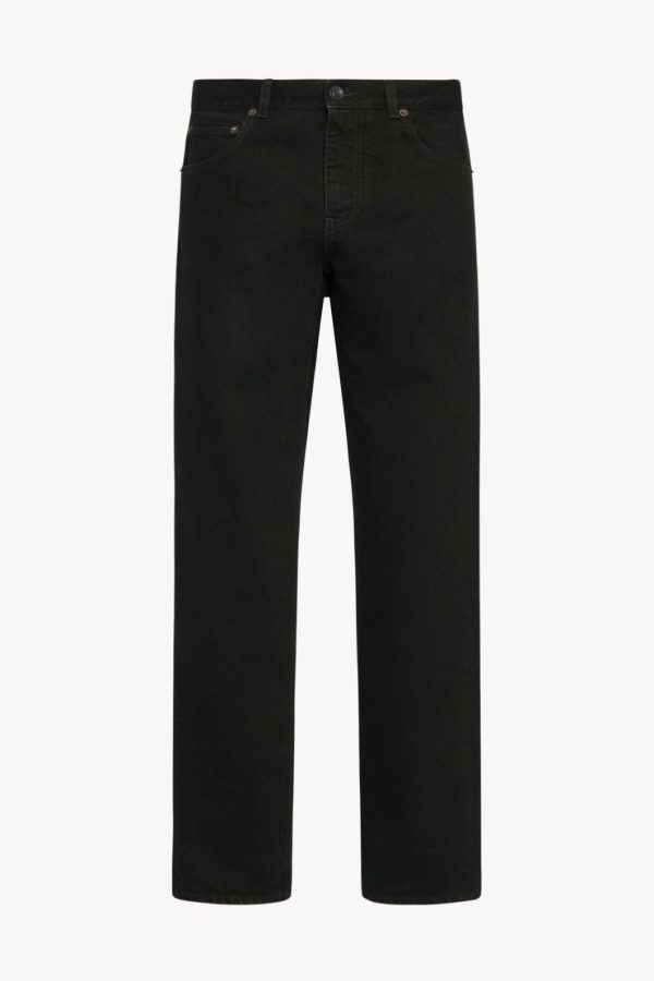 High-rise jean in mercerized cotton denim with straight leg, tonal topstitching, and classic 5-pocket construction.