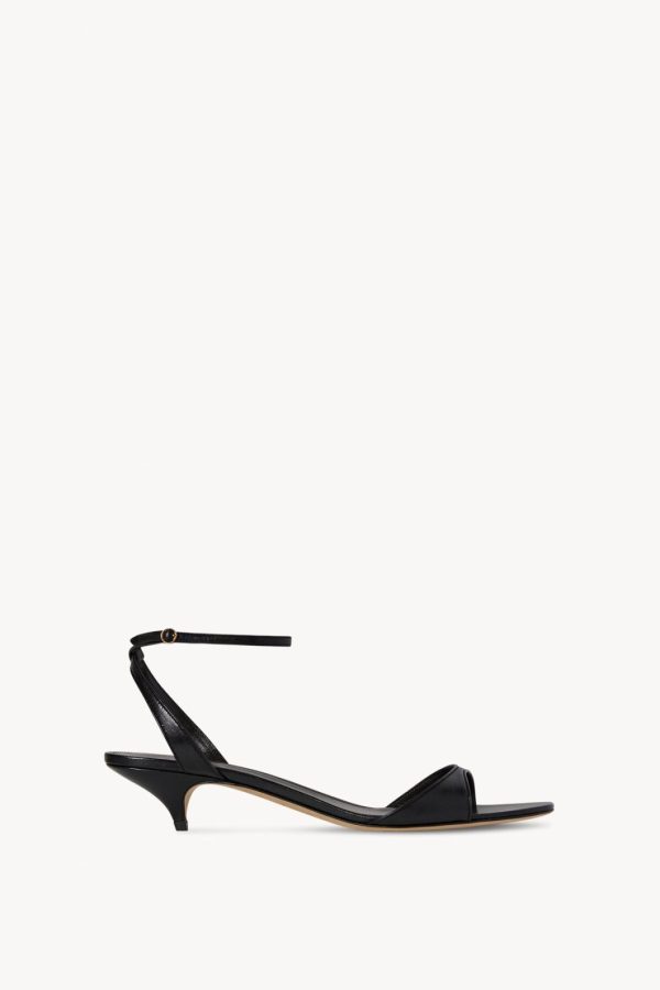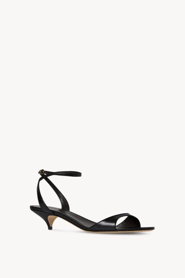 Refined heeled sandal in soft lambskin leather with delicate buckled ankle strap and tapered heel.