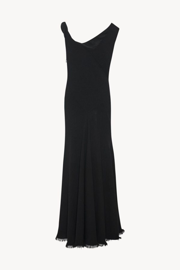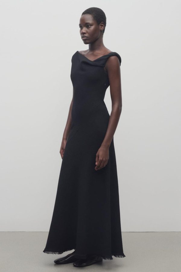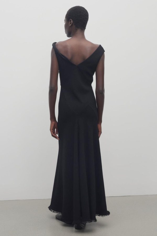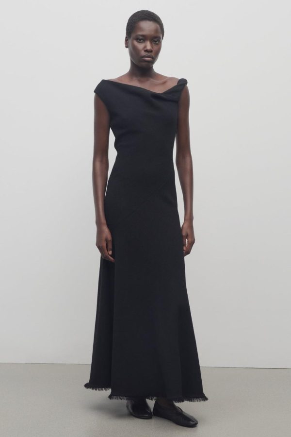 Ankle-length evening dress in textured matte wool crepe with asymmetrical neckline, paneled construction, and flared fit.