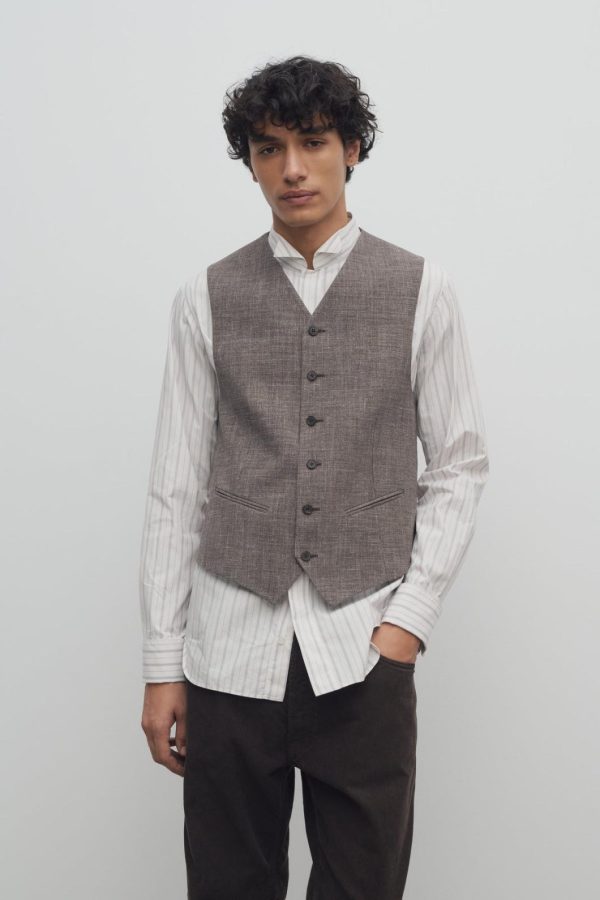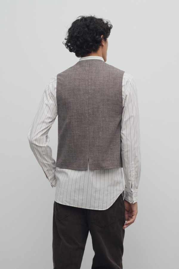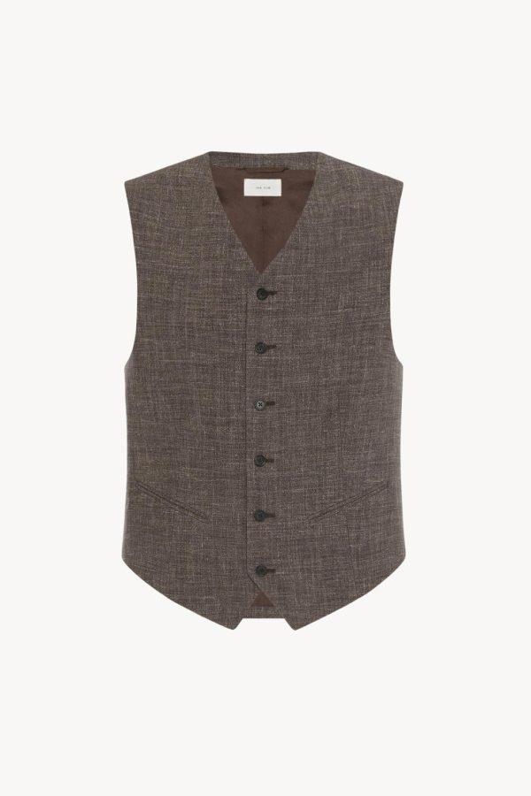 Single-breasted tailored vest in structured silk and linen canvas with front besom pockets, center back vent, and horn button closure.
